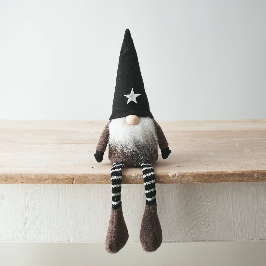 Add a cute, but spooky addition to your halloween decor with this large dangly legged gonk, complete with a tall point witchy hat, fuzzy beard and monochrome stripped legs.