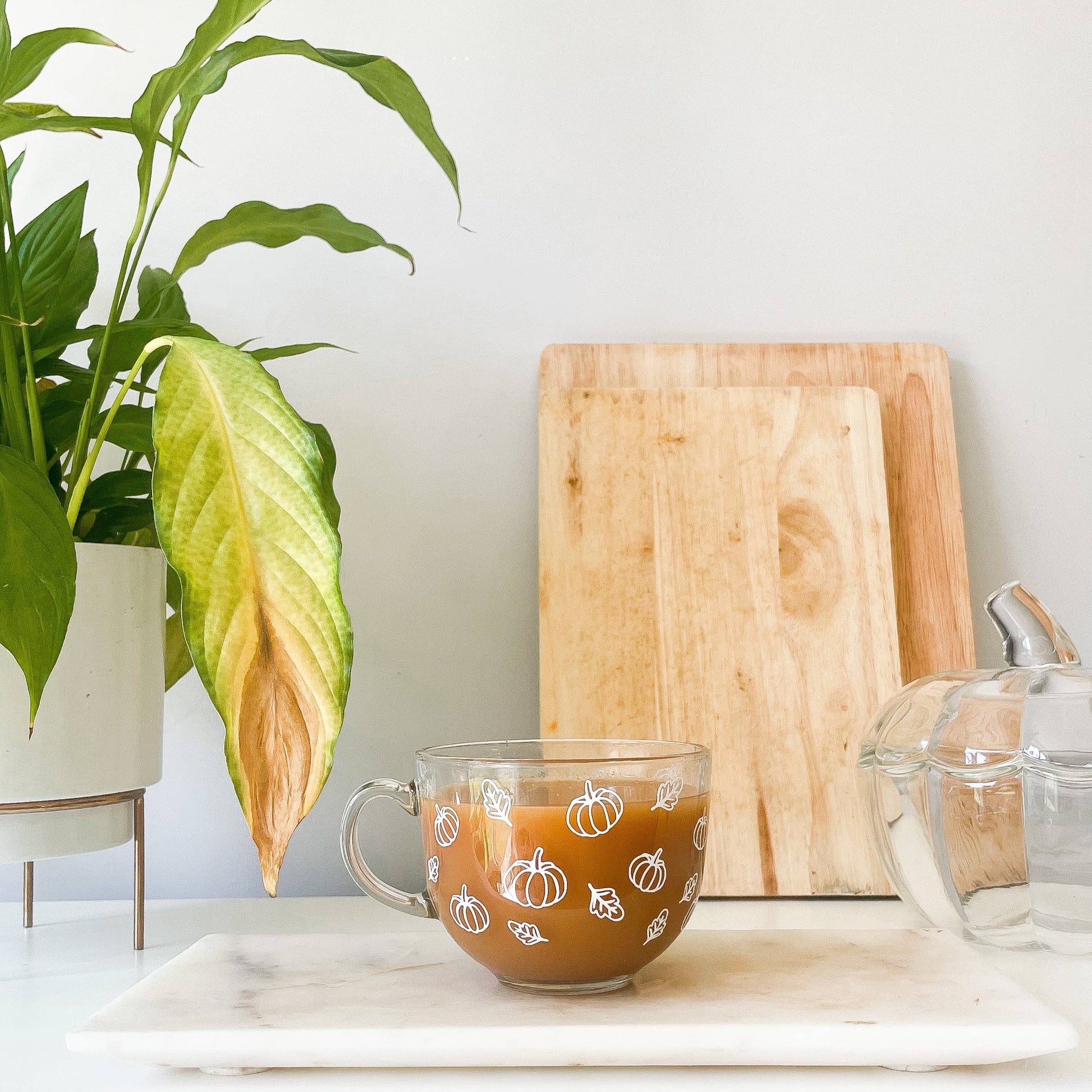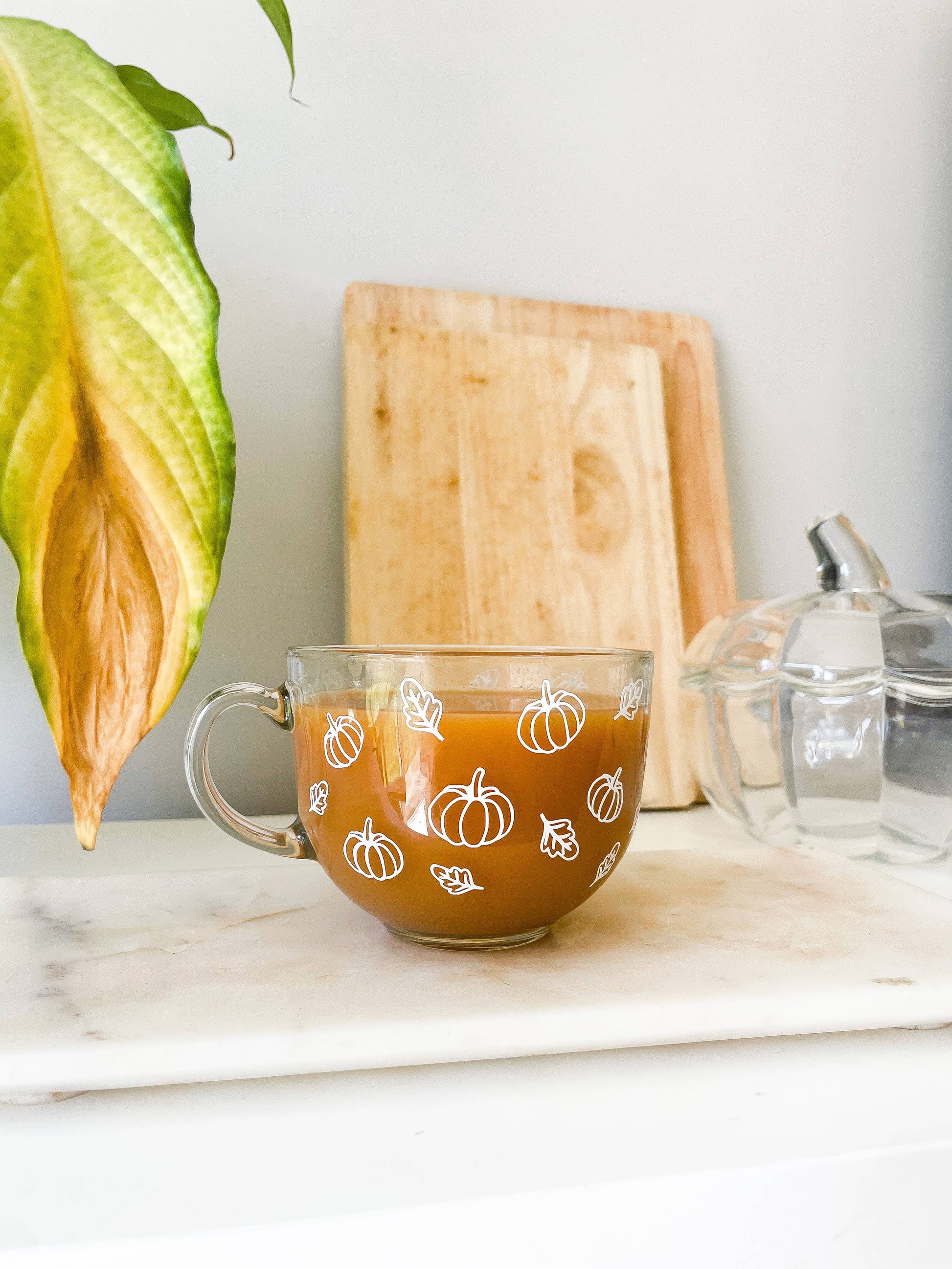 A cute seasonal Pumpkin glass mug giving us all the Autumn vibes.
